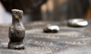 Forgiatura del ferro a caldo senza saldature. Ogni personaggio è stato ricavato da una lama di cm 40 x 11x 2,5 il viso è scolpito a mano e ognuno ha una diversa espressione.